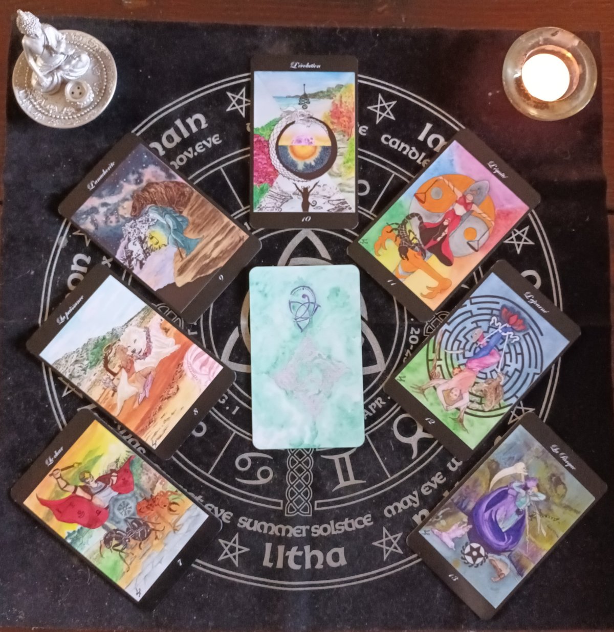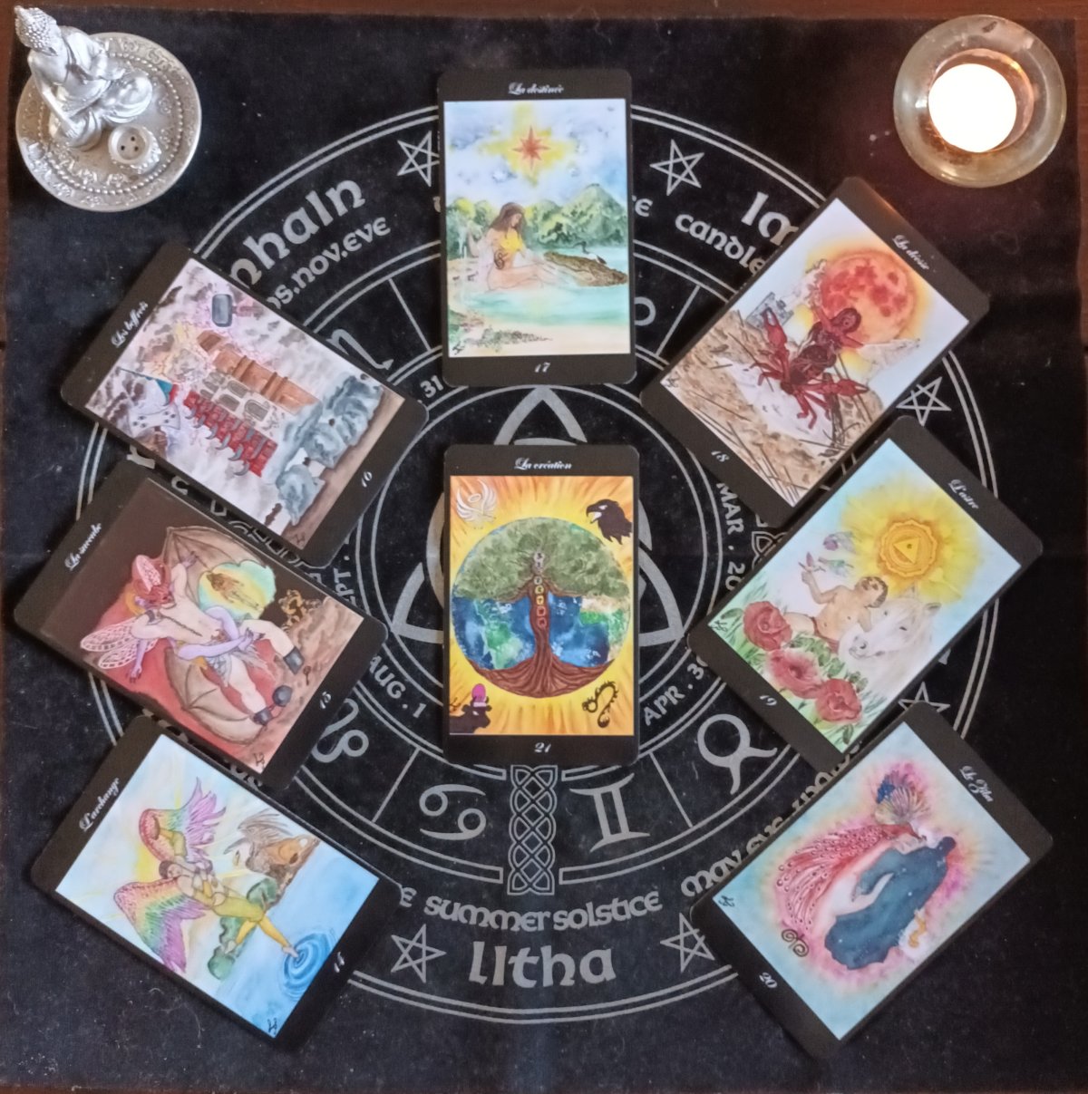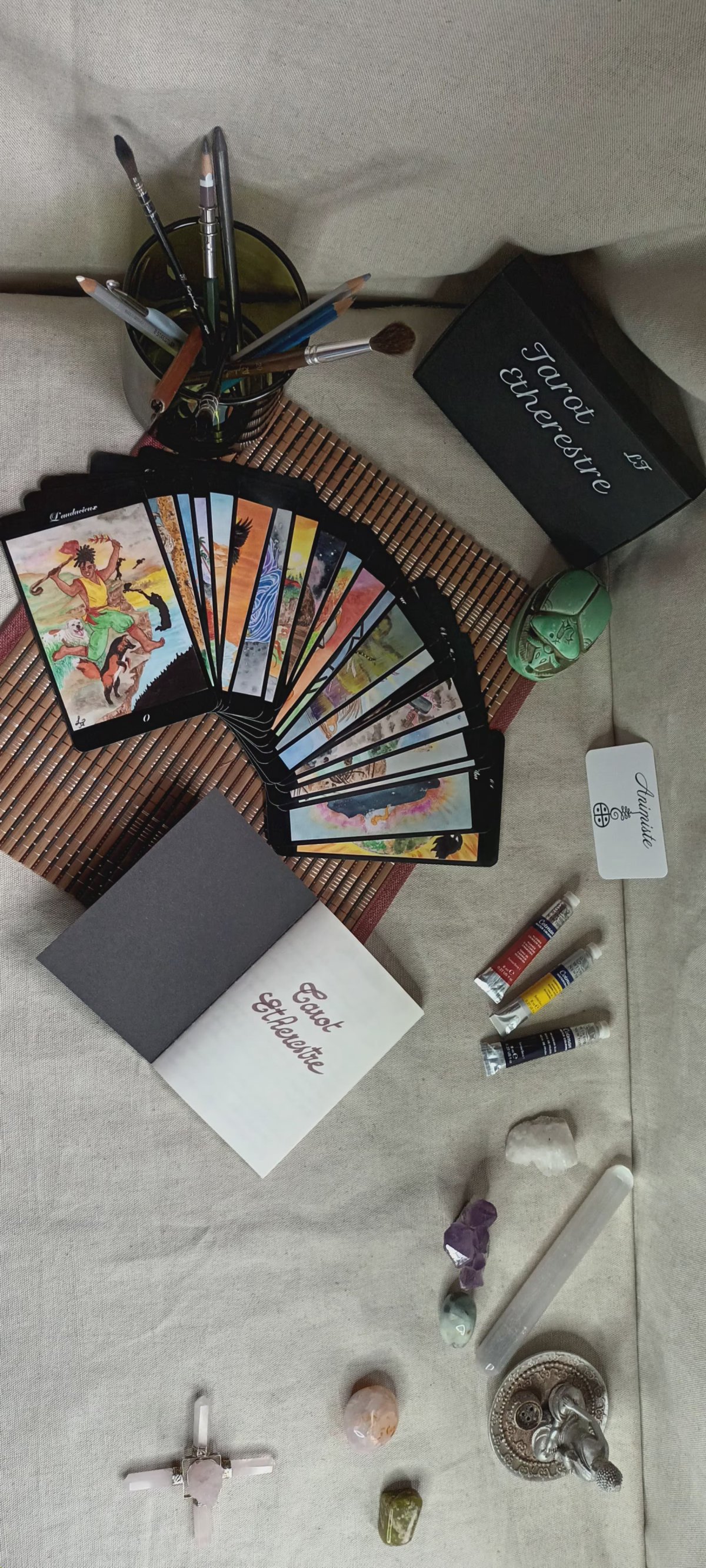 Le Tarot Etherestre est composé des 22 Lames Majeures, sur la base du Raider Waite Tarot. Les illustrations sont à l'aquarelle, le livret explicatif est manuscrit.