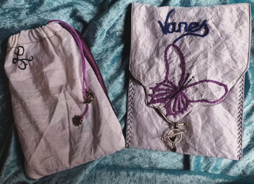 A la demande, seront confectionnées par mes soins deux pochettes personnalisées en tissus en sus du jeu.