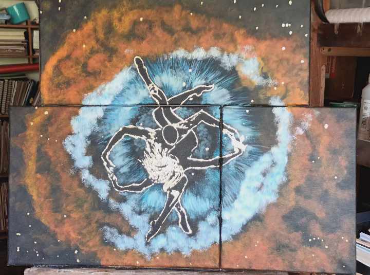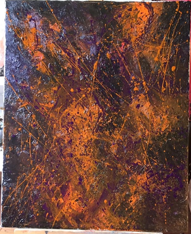Tableau à l'acrylique, peintures métallisées argent et violet, jaune de cadmium foncé, rouge de naphtol carmin et bleu outremer foncé.