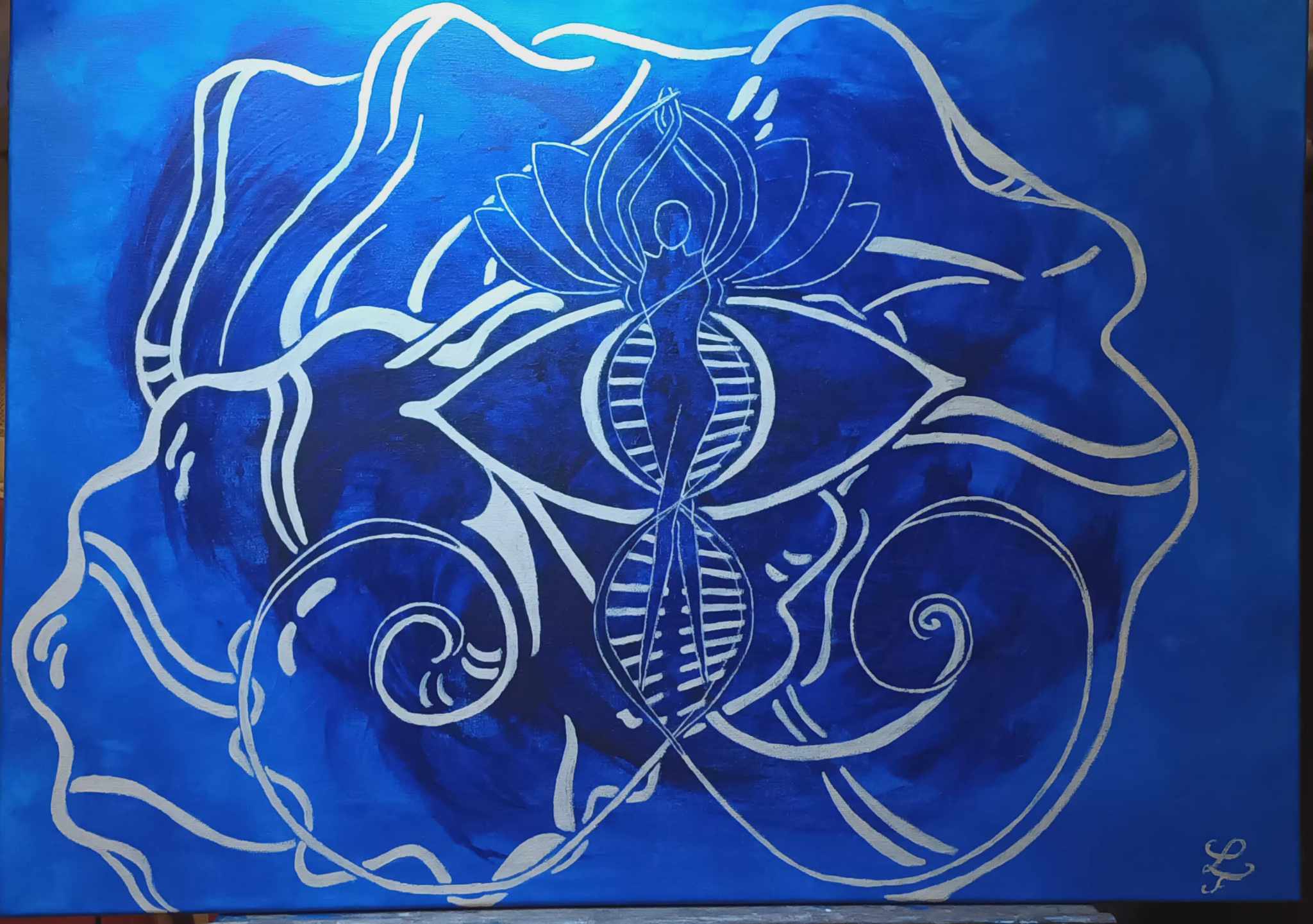Tableau à l'acrylique, symbolique où nous pouvons voir plusieurs symboles qui ont tous un lien avec l'humain, mais pas seulement, tout est un et chaque chose se trouve en chacun: tout est indissocié.